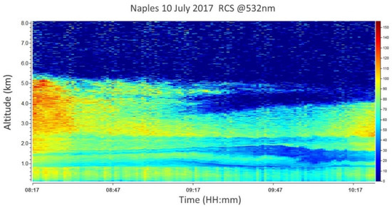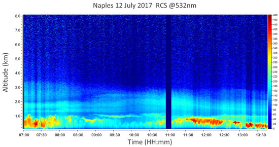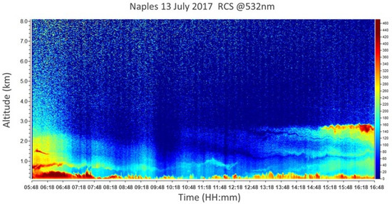 On 13 July 2017, no signature of Saharan dust was observed above the measurement area, as confirmed by model outcomes (Figure 2 and Figure 3). Lidar observations were carried out from 05:48 to 17:30 UTC, as shown in Figure 15. This allows for characterizing the fresh biomass burning aerosol produced by the Vesuvius fire dispersed across a short distance and following its temporal evolution. Figure 15 displays the time variability of the RCS measured continuously from 05:48 to 16:48 UTC. The figure highlights a diffuse atmospheric layering related to the forest fire aerosol.