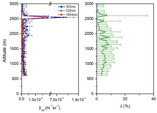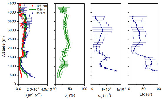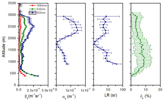 Vertical profiles of the aerosol backscattering coefficient (βa(z)) at 355, 532 and 1064 nm were obtained from lidar observations both in the daytime and nighttime through retrieval by the Klett–Fernald algorithm [27,28] and Raman method [29], respectively.