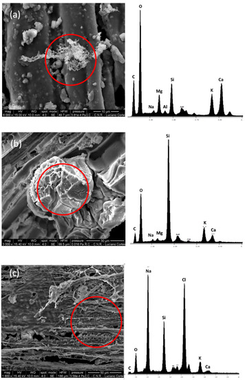 SEM-EDX analysis of the samples (Figure 19, right panels) highlights a prevalence of carbon material deriving from a biomass combustion process and of Si, K and Ca (a, b) deriving from the inorganic fraction of the biomass. Moreover, a small contribution of marine aerosol (Na and Cl) (c) due to the sea breeze circulation that develops during the day can be also identified.