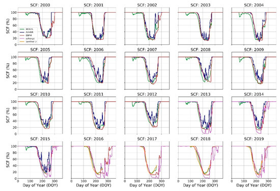 Time series comparing the land-averaged SCF derived using the MODIS dataset (green, 2000–2019), AVHRR (blue, 2000–2015), EBFM (dark red, 2000–2019), seNorge (purple, 2013–2019) and Sentinel-2 (orange, 2016–2019).