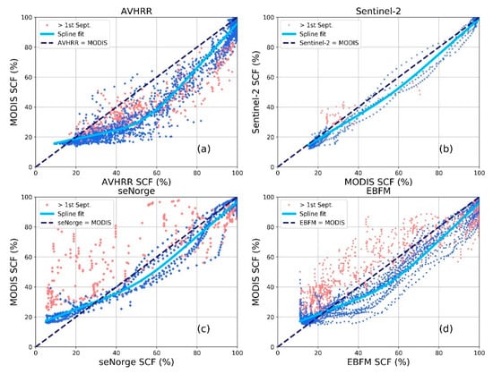 Figure 4 is a representation of the data shown in Figure 3, as a scatter plot. Here the SCF values from each dataset were plotted against the MODIS SCF, with the time series separated into two periods corresponding to data from 1 March–31 August (blue) and from 1 September–31 October (coral), or until the end of the dataset being compared. This was done to separate snow cover estimates made during the spring melt period and those from autumn snow onset. In all but the case of the Sentinel-2 dataset, the lower resolution data from AVHRR and the snow models were plotted on the x-axis, with MODIS along the y-axis. Since the Sentinel-2 data are at higher resolution than the MODIS dataset, these were plotted along the y-axis to derive the relation that transforms the lower resolution dataset to the SCF estimates of the higher resolution sensor. Since this study endeavors to examine the differences in timing of snow disappearance between the datasets, the most critical period for dataset correction is the snow melt period. As such, the function used to transform the datasets is obtained by fitting a cubic spline function to the pairs of data obtained only in the period from 1 March–31 August (blue datapoints) to derive the general relationship with the MODIS values; this is displayed by the light blue curves. The number of scatter points in each plot reflects the size of the dataset, with the AVHRR and EBFM datasets being the largest with respectively 16 and 20 full years of data that overlap with MODIS. Of all four datasets being compared against MODIS, there is poorest agreement with the AVHRR dataset, in terms of magnitude. This is especially true when the land-averaged MODIS SCF lies the range 30–60%, with the corresponding AVHRR SCF being on average 20% greater than MODIS. On the other hand, the land-averaged SCF obtained from Sentinel-2 generally agrees well with MODIS at low (<25%) and high (>90%) snow cover fractions. At all other snow cover fractions, the Sentinel-2 snow cover fraction is in general lower than MODIS and can reach up to nearly 10% lower than MODIS. For the seNorge dataset there is generally a good but non-linear correlation with the MODIS values, when considering only the SCF data from between 1 March–31 August. There is clearly a large spread in values for SCF obtained in the period 1 September–31October, but for the melt period of interest the land-averaged SCF derived from seNorge is of the order 5–10% greater than MODIS when MODIS SCF is >30%. For the EBFM dataset, shown in Figure 4d the relationship between the MODIS SCF and the model-derived SCF is similar to that of seNorge snow model, but the EBFM estimates can be on average up to 15% greater than MODIS for the period between 1 March–31 August, as indicated by the largest offset between the fitted spline (light blue curve) and the equality line (dark blue, dashed) while EBFM estimates of SCF obtained from after September 1 which corresponds to the start of the hydrological year, are consistently lower than MODIS.