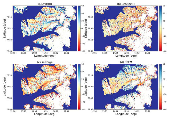 The difference in annual number of days with snow cover derived from each of the data products and that obtained from MODIS was mapped. To make this geographical comparison, a binary snow map was first obtained. For the fractional snow cover products SCF was thresholded at 50%, where SCF below the threshold is defined as “no snow” and SCF greater than the threshold, “snow”. Hence, for each pixel in the grid, the number of days the pixel was classified as snow covered/not-snow covered during each year of data coverage using the datasets was calculated. The difference in number of days with snow cover between AVHRR/Sentinel-2 and MODIS, and the two snow model datasets and MODIS was then calculated. For the remote sensing datasets, the difference in number of days with snow applies only to the part of the year outside of the polar night period. For the AVHRR dataset, this is the difference in number of days with snow between 1 March and 30 September, while for Sentinel 2 it is restricted to only the period 15 April–15 September. Since the two snow models produce SWE and SCF for the entire year, the full period of MODIS coverage from 1 March–31 October is used in the comparisons.