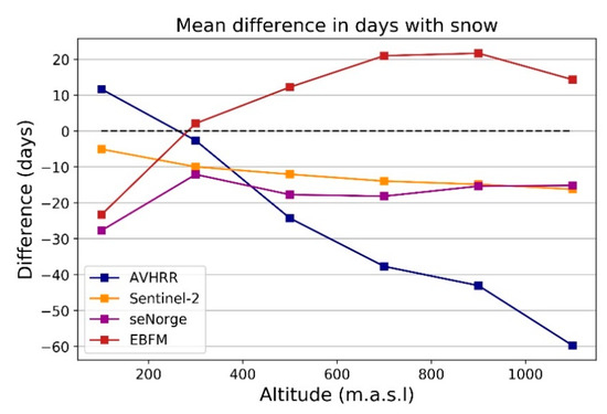These elevation-dependent differences in the mean number of days with snow per year, between the different remote sensing and snow model datasets, and MODIS, is illustrated in Figure 6. This figure was produced by averaging the mean differences in number of days with snow (Figure 5) over all elevation zones at intervals of 200 m between 0 and 1200 m.a.s.l. using a high resolution (20 m) Digital Elevation Model (DEM). Here, the x-axis of Figure 6 represents the middle point of each elevation interval. Figure 6 therefore demonstrates that the degree of overestimation in mean number of days with snow by AVHRR in the low altitude areas (0–200 m.a.s.l.) is in fact only of the order of 10 days on average for the whole area of interest. The magnitude of underestimation in mean number of days with snow estimated by AVHRR with respect to MODIS increases with elevation, with the data suggesting underestimations of approximately 40 days or more for all altitudes intervals above 600 m.a.s.l. As shown in Figure 5b, Sentinel-2 data exhibit of the order 10–15 fewer days with snow on average compared to MODIS at all elevations, though at the lowest altitudes the difference is only 5 days.