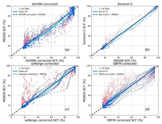The Sentinel-2 dataset, with the highest spatial resolution of all the datasets but relatively small temporal period of coverage, was used to adjust the lower-resolution MODIS SCF time series by applying the obtained spline fit (Figure 4b) to the MODIS time series. With the adjusted MODIS time series, spline fits to the three remaining datasets were subsequently updated and applied to the respective time series to obtain a final corrected SCF for the three remaining lower resolution datasets (AVHRR, seNorge and EBFM). The objective of this procedure was to normalize the snow cover observations from each dataset to a baseline in order to achieve better consistency between the products. The final corrected SCF time series and the corresponding spline fits associated with these are presented in Figure 7a–d. While there remains a degree of spread in the land-averaged SCF values, the corrected time series are on average much closer to the MODIS values, as exhibited by the final spline fits which lie close to the equality line (dark blue, dashed). In particular, the relationship between the corrected datapoints and the MODIS datasets for the melt period between 1 March–31 August is more linear compared with their original time series. This is true for all datasets.