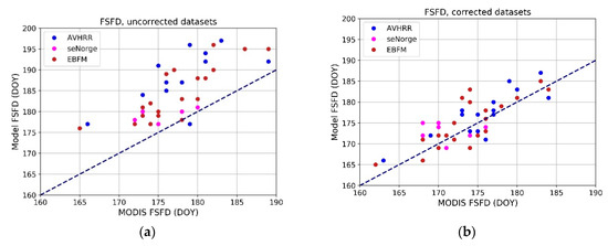 (a) First snow-free day estimates shown for the three uncorrected lower resolution AVHRR, seNorge and EBFM datasets, plotted against the uncorrected MODIS land-averaged FSFD estimates. A dark blue dashed line indicates where the FSFD estimates would be equal and (b) FSFD estimates obtained from the corrected MODIS, AVHRR, seNorge and EBFM datasets.