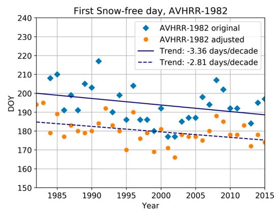 For the FSFD estimates extracted using the original AVHRR time series from 1982–2015, shown in Figure 9, FSFD occurs later compared with those extracted from the corrected time series. The offset between the two linear trend lines is approximately 15 days, indicating that using the original AVHRR SCF time series results in FSFD estimates that are later by on average 2 weeks when compared with the FSFD estimates extracted from the corrected time series. Moreover, the slope of the linear trend line is also smaller, with a decadal trend in FSFD of −3.36 days/decade (p = 0.08) for the uncorrected time series, while the decadal trend in FSFD estimated with the corrected AVHRR SCF time series is −2.81 days/decade (p = 0.01). Hence, not only does the decadal trend in FSFD derived from the corrected time series become significant at the 95% confidence level, but the advance in FSFD is >0.5 days/decade slower than that suggested by the original AVHRR dataset.