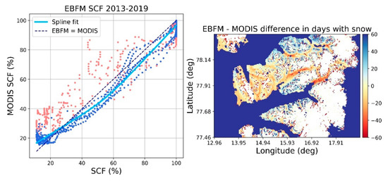 (left) Scatter plot showing the relationship between MODIS and the EBFM land-averaged snow cover fraction using data corresponding to the seNorge period (2013–2019) and (right) the average difference in number of days with snow comparing EBFM and MODIS for 2013–2019.