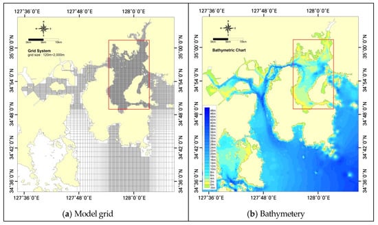 A hydrodynamic model was used to generate marine physical factors, such as the currents, water level, salinity, and temperature, in the study area. The Delft 3D model, which has been applied in several research areas, was used to simulate three-dimensional hydrodynamics [41,42,43,44]. The model domain extended for 58 km along the north–south direction and 53 km along the east–west direction, to sufficiently cover the study area. The model grid contained 155 × 245 horizontal cells and, to optimize the computational time, fine and coarse grids were formed in the study area and open sea area, respectively. A total of five vertical layers were modeled to replicate the interaction between the vertical layers and the vertical distribution of salinity and water temperature. Bathymetry for the study area was obtained from the latest navigational charts and the survey data of the Korea Hydrographic and Oceanographic Agency (KHOA). As shown in the bathymetry chart in Figure 3, the bay has a relatively shallow depth and the channels are relatively deep.