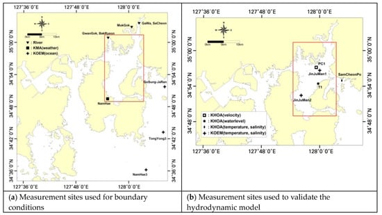 Figure 4. Locations of the KMA, KOEM, KHOA, and river monitoring stations in the study area. (a) Measurement sites used for boundary conditions. (b) Measurement sites used to validate the hydrodynamic model.