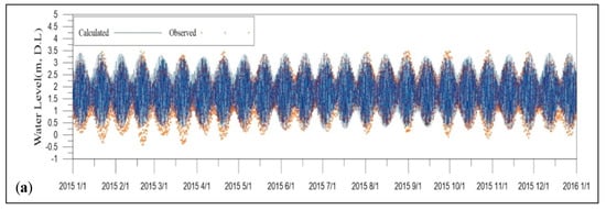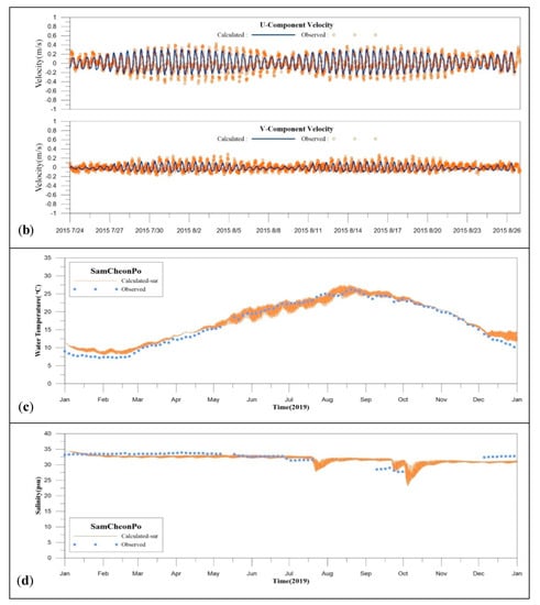 The water levels in the study area fluctuated by approximately 3 m and were primarily affected by the tides. The average difference in the water level between the hydrodynamic model and the observed values was approximately 10 cm, and the absolute error was within 8–10%, with slight differences every year. The currents observed between 24 July 2015 and 26 August 2015 were classified into a U-component—moving east–west—and a V-component—moving north–south. As shown, the U-component was the dominant current in the study area. The U-component current flowed as fast as 0.5 m/s and fluctuated based on the tidal cycle. Although the hydrodynamic model results appear to underestimate the current patterns, the results are reproduced well. The temperature was below 10 °C during winter and almost 30 °C during summer, with clearly noticeable seasonal variations. The water temperature varied between 13 °C and 20 °C during spring and autumn, with the lowest temperature in February and the highest temperature in August. Considering the predicted daily temperatures, the hydrodynamic model adequately reproduced the annual temperature-change pattern, and the average RMSE of the temperature was 0.862 °C. The salinity was highly influenced by the river flow, i.e., during spells of high rainfall, the salinity temporarily decreased before increasing to approximately 32–33 psu. The average RMSE of the salinity was 0.6 psu, as shown in Figure 5.