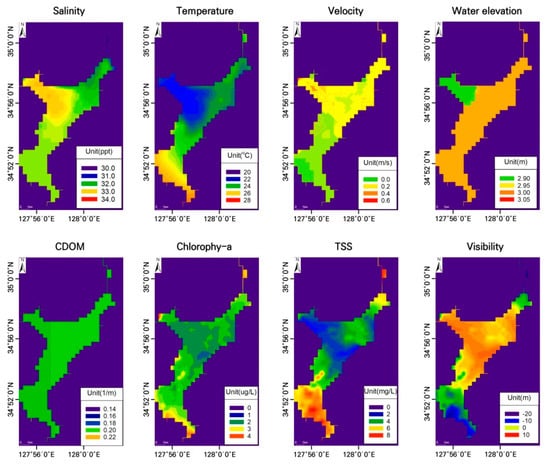 Figure 6. Spatial distribution of training data in the study area: salinity, temperature, currents, and water levels from the hydrodynamic model, and CDOM, chlorophyll-a, TSS, and visibility from the satellite ocean color data.