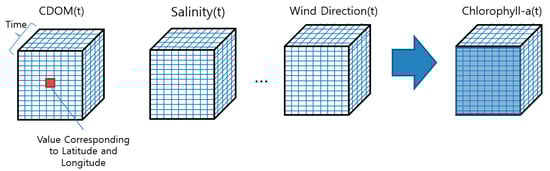 Figure 7. Construction of the deep learning model for estimating the temporal and spatial distribution of chlorophyll-a. To utilize spatial information, the input data were organized in a matrix accumulated over time. The value corresponding to each row and column corresponds to the latitude and longitude of each data.