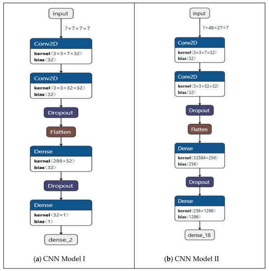 Figure 8. (a) Algorithm of CNN Model I and (b) CNN Model II. CNN Model I uses seven images of 48 × 27 grid size and estimates the chlorophyll-a value in a 48 × 27 grid format. CNN Model II uses segmented images in a 7 × 7 grid format and estimates the chlorophyll-a value.