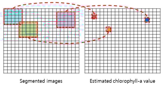 To solve the problem of insufficient data, we designed another deep learning model—CNN Model II—using segmented images in a 7 × 7 grid format. CNN Model II estimates target values only using the data around the point of interest and, consequently, the volume of training data used in CNN Model II is around 300 times more than that of CNN Model I. Therefore, CNN Model II can extract and analyze inherent patterns in the training data more accurately. The average RMSE of CNN Model II was 0.191, which is significantly lower than that of CNN Model I, which was 0.463. Moreover, the spatial concentration of chlorophyll-a was well estimated by CNN Model II, thereby proving the efficacy of the deep learning model.