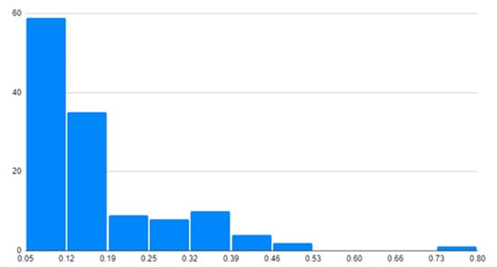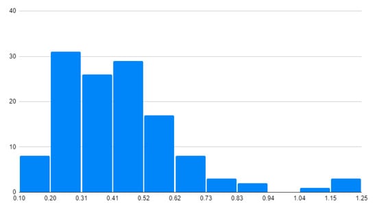 Figure 13. RMSE distribution for 128 images using the CNN Model II: histogram with the range of RMSE values on the X-axis and the number of images on the Y-axis.
