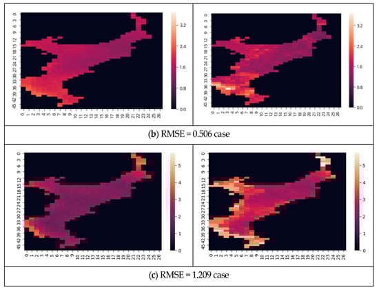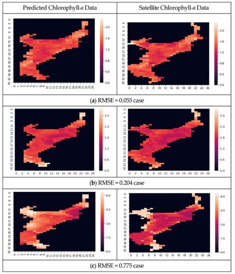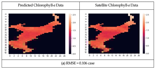 In the case of a low RMSE value (RMSE = 0.055), the predicted chlorophyll-a values were almost the same as those of the satellite chlorophyll-a values. Furthermore, the spatial variations of chlorophyll-a concentration were properly estimated. The case with an RMSE value close to the average value (RMSE = 0.204) also demonstrated similar results to the observed values. In particular, the changes in the spatial concentration were estimated accurately. In the case of a high RMSE value (RMSE = 0.775), the model accurately reproduced the spatial concentration pattern but tended to underestimate the concentration at some points. The satellite data exhibited large variations in the concentration between adjacent points, whereas the deep learning model corrected this drastic change and estimated it smoothly in space, as shown in Figure 14.