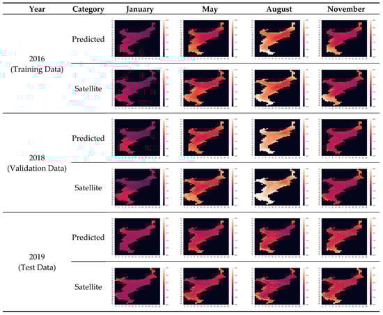 The monthly averaged satellite data and model data were compared to determine whether the prediction model developed herein can adequately estimate the seasonal changes in plankton concentration. In 2016 and 2018, the chlorophyll-a concentration was low in January—the winter season—but high during spring and summer. The concentration decreased again in November, which clearly demonstrates the seasonal fluctuations in plankton concentration in the study area. The developed model successfully estimated the seasonal fluctuations in plankton concentration in 2016 and 2018. Notably, although the seasonal fluctuations in 2019 were relatively small compared to those in 2016 and 2018, the developed model accurately estimated the small seasonal and local concentration changes, as shown in Figure 16.