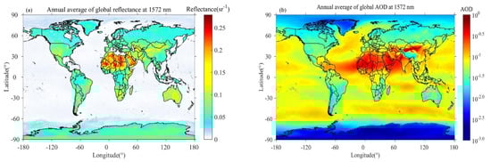 (a) Annual average of global surface reflectance in 2018. (b) Annual average of global aerosols optical depth (AOD) in 2018.