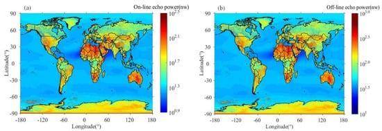 where and are the reflectance of 1640 nm and 2130 nm, respectively. Figure 3a shows the annual average of global surface reflectance in 2018. The atmospheric transmission efficiency at 1572 nm is mainly caused by the absorption of atmospheric aerosols. The aerosols optical depth (AOD) at 1572 nm can be calculated by the relationship between AOD and Angstrom’s exponent at two known wavelengths. Figure 3b shows the annual average of global AOD at 1572 nm in 2018. The total integrated double-path optical depth caused by atmospheric CO2 molecules is calculated from an assumed CO2 column-averaged dry-air mixing ratio (XCO2) of 400 ppm and the spectroscopy database HITRAN 2016 []. Furthermore, the echo power of online and offline signals calculated by Equation (1) is shown in Figure 4. Figure 4 shows that the minimum echo power of the spaceborne IPDA LIDAR system is 10 nW and the maximum echo power is 690 nW. The dynamic range of echo signal power is approximately 70.
