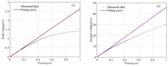 In the airborne experiment, a problem of data inversion caused by nonlinearity was found []. The signal with peak voltages greater than 400 mV could not be used to retrieve CO2 with high accuracy. Figure 5 shows the detector linearity test setup and instruments. Figure 6a shows the output peak voltage of the airborne prototype detector varying with input power. Figure 6b shows the output integral voltage of the airborne prototype detector varying with the input power. The actual output voltage in Figure 6 is negative. For descriptive convenience, the absolute values of output peak and integral voltage are taken here. The integral voltage value is obtained by adding the voltages of all points on the pulse, and its value depends on the sampling rate. Figure 6 proves that when the peak voltage is greater than 400 mV, there is a serious nonlinear phenomenon. The expression of linearity is