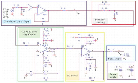 In order to detect accurately in this dynamic range, the noise of the amplifier chip and the linearity of the signal response should be considered simultaneously. The high-speed, low-noise operational amplifier (OA) was selected as the amplifier chip. On the basis of the original airborne ACB design, CADENCE simulation at twice amplification is carried out for the ACB of spaceborne IPDA LIDAR, as shown in Figure 8. The CADENCE simulation for ACB consists of six parts: simulation signal input, impedance matching, OA, DC blocks, signal output, and power supply. The cyan line in Figure 7c is generated by the simulation signal input part in Figure 8, which is almost consistent with the blue line in Figure 7c. The green line (the same as the cyan line in Figure 7c) and the red line in Figure 9 are the input signal and output signal of the ACB in simulation. Combining the APD photoreceiver model in Figure 7a with the CADENCE simulation of ACB in Figure 8, we can get the output voltage of the detector when it changes with input power. Figure 10 shows the curve of the output voltage changing with the input power. In the simulation, the transfer function of the APD photoreceiver is linear. By comparing the curve change trend in Figure 10 with Figure 6, it can be concluded that the ACB is the main factor leading to the nonlinearity of the IPDA LIDAR system.