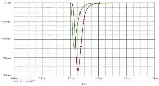 Without considering the ground fluctuations, the width of laser pulses before reaching the detector is about 15 ns. Due to the satellite altitude of 705 km, the time interval between the echo pulse and the monitoring pulse is about 4.7 ms. When laser pulse is focused on the APD photosensitive surface, photoelectric conversion occurs. The APD photoreceiver is widely used in various fields [,,]. The preamplifier is a reverse amplifier with a bandwidth of 8.9 MHz. Therefore, after the APD photoreceiver, the signal is reversely broadened to about 40 ns. A fifth-order active filter is used to filter the signal and improve the linearity of the ACB. Finally, through CADENCE simulation, the optimized ACB bandwidth is designed as 1 MHz. After optimizing the ACB, the signal is further broadened to about 390 ns.