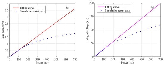 (a) Simulation data of output peak voltage of the optimized ACB changing with input power and its fitting straight line. (b) Voltage differences between simulation data and fitting straight line in Figure 12a. (c) Simulation data of output integral voltage of the optimized ACB changing with input power and its fitting straight line. (d) Integral voltage differences between simulation data and fitting straight line in Figure 12c.