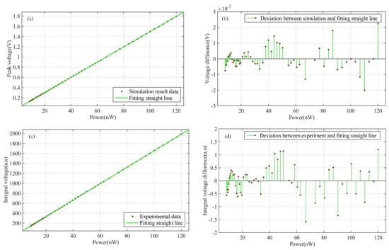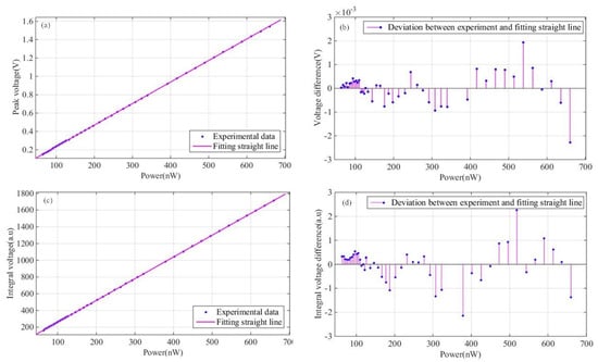 (a) Experimental data of output peak voltage of the optimized ACB varying with input power at magnification of 60 and its fitting straight line. (b) Voltage differences between experimental data and fitting straight line in Figure 15a. (c) Experimental data of output integral voltage of the optimized ACB varying with input power at magnification of 60 and its fitting straight line. (d) Integral voltage differences between experimental data and fitting straight line in Figure 15c.
