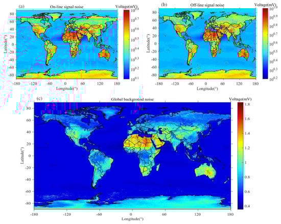 When the gain (M) of APD photoreceiver is 10, and the amplification (F) of optimized ACB is 10, the peak voltages of the online and offline monitoring signals are set to 1.40 V and 0.70 V, respectively. According to the detector model in Section 3, the peak voltages of online and offline echo pulses are in the range of 0.025–0.78 V and 0.055–1.70 V, respectively. Figure 16 shows the global online and offline echo peak voltage distributions. Signal noise, background noise, APD photoreceiver noise, ACB noise, and quantization noise are the main factors causing RE. The expressions of these noises are given by Ehret et al. [] and Kiemle et al. []. The calculation of noise is not repeated here. Because signal noise and background noise are related to the intensity of light, they are affected by surface reflectance and atmospheric transmittance. Figure 17 shows the global signal noise distribution of online and offline echo signals, and global background noise distribution. When the high voltage of the APD photoreceiver is constant, the APD photoreceiver noise is constant. The noise of the ACB varies linearly with its amplification. When the measurement range of the DA remains unchanged, the quantization noise is also a fixed value. Table 2 shows the values of four signals and all noise sources.