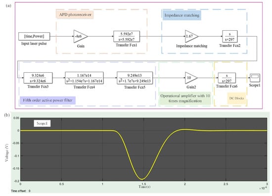 In prior system simulation work, the conversion process of the laser pulse in detector was unknown. According to LIDAR system parameters, only signal amplitude and the root mean square value of noise can be calculated. The actual pulse signal waveform and noise characteristics cannot be obtained from simulations. According to the principle of the optimized ACB in Section 3, the transfer model of the detector is established by SIMULINK, as shown in Figure 20a. The transfer function of impedance matching depends on the extent of matching with APD photoreceiver output impedance and first-order high pass filter characteristics. The first transfer function of the fifth-order active power filter is a first-order low-pass filtering characteristic, as shown in Equation (4). The second transfer function of the fifth-order active power filter is a second-order low-pass Sallen-key type filter, which can be expressed by