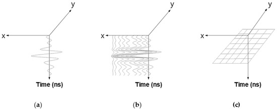 GPR operates as shown in Figure 2. A-scan, B-scan, and C-scan transformations are used to investigate the radar velocity, and a calibration process is presented to obtain this velocity. In the case of A-scan, there is a single reception wave, and B-scan refers to a method of visualizing a set of consecutive reception waves along a specific direction. The method of collecting B-scan data and visualizing the horizontal area of the x- and y-axes along the z-axis is called C-scan.