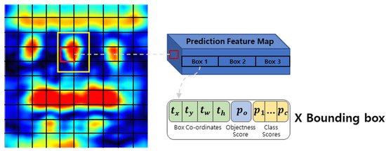 As shown in Figure 4, YOLO-v3 estimates multiple bounding boxes simultaneously for one CNN in addition to estimating the class probability for each bounding box. The CNN used here is called the backbone network, which is used for generating feature maps. This feature map comprises several grid cells, and YOLO-v3 can simultaneously determine the type and location of the target object by applying the score method to each cell [20,21,22].