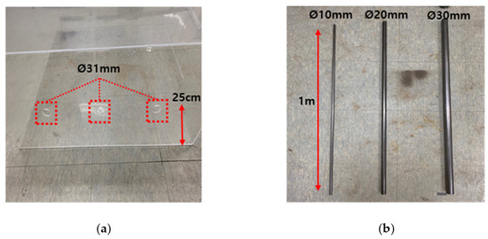 For GPR data acquisition, as shown in Figure 5, an acrylic box specimen and a rebar specimen were prepared. The size of the acrylic box specimen was 80 × 80 × 50 cm3, and each of the holes was ∅31 mm at a height of 25 cm, and was made for the installation of the rebar.