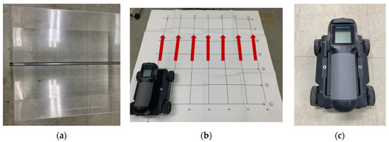 Data acquisition method and equipment: (a) setting rebars on acrylic specimen, (b) a total 11 cases of data were acquired seven times in the direction perpendicular to the rebar by using GPR on the upper part of the specimen, and (c) equipment used in the experiment.
