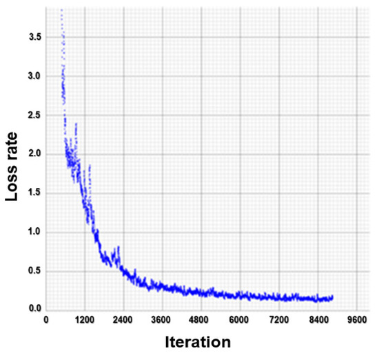 In addition, the decay value, which is a weight penalty that reduces overfitting, was set to 0.0005, and the active function used a leaky rectified linear unit (ReLU) to maintain a constant learning rate. The weight value was obtained by 9000 iterations of learning, and the learning time was approximately 30 h. The results are shown in Figure 9 and Figure 10.