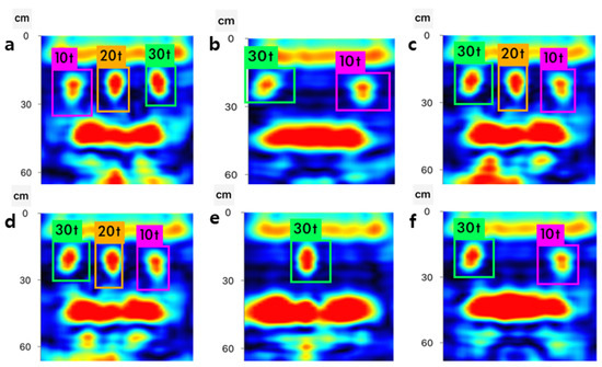 Migrated data rebar area search and diameter estimation results. Descriptions of (a–f) are given in the Table 5.