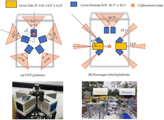 The sensor configuration of our two multiple-lidar systems. The extrinsic is refined to the front-view lidar in (a), and the geometric center in (b), respectively. Five Livox Horizon lidars were included in the UGV platform, composing a FoV. While, the passenger vehicle platform had two Livox Tele-15 and six Livox Horizon lidars, with no overlaps between any two lidars.