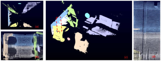A qualitative example of the good feature selection method. The UGV runs into a narrow district, where the surroundings are blocked by walls. With the lazier–greedy algorithm, only the surface features providing strong geometric constraints are picked in (a), and the local map is well maintained in (b). On the other hand, once all the surface features are imported in (c), the local map in (d) is blurred due to textureless regions. The amount of surface points in (a,c) are 1125 and 11,243, respectively.