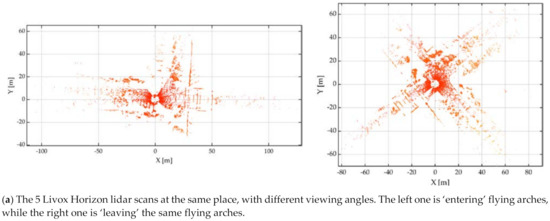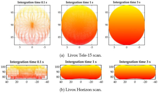 As shown in Figure 4, two different types of Livox series lidars are applied, the Livox Tele-15 and Livox Horizon. The first one is a long-range, high-density lidar, with structured circular scan pattern, the FoV is 14.5° × 16.2°. While the Horizon is totally different from Tele-15 with six laser scan diodes ‘brushing’ arbitrarily in the 81.7° × 25.1° FoV. Various lidars can be connected, either with a Livox Hub or a switch, and we used the time synchronizer in robot operation system (ROS) [37] to fuse and synchronize the lidars.