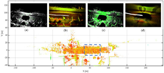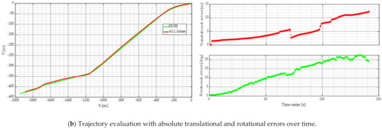 For quantitative analysis, the absolute position and orientation errors are plotted in Figure 10d for detailed reference, showing that multi-lidar fusion had a great impact on improving the positioning accuracy. The mean and the root mean square error (RMSE) of position error were 2.452 m and 3.618 m. In addition, the mean and RMSE of attitude error were 11.967° and 5.675°.