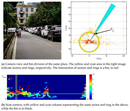where , and a scan context can be encoded by assigning the maximum height of the 3D points within each bin through: