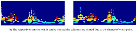 where and are the object and candidate column vectors at the same index. Since the column vectors describe changes in the azimuthal direction, they may be shifted even in the same place for a change of view-point. On the other hand, the row vector is dependent on the sensor location, and always consistent for the identical location. In this respect, the performance of scan context is limited in indoor environments, where variations in the vertical direction are insignificant. The change of view-point can be determined by column shifts:
