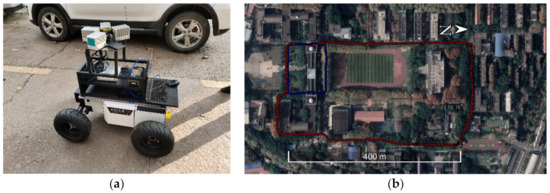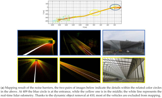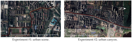 As shown in Figure 9, two experiments were carried out on this platform: the first one was in a low-speed, low-kinematic urban scene, with the overall length and time cost of 1.5 km and 342 s. The second one tried to assess the mapping consistency in tunnels, and a long acoustic barrier on the overpass was chosen. The path is around 2 km long, with a time consumption of 141.5 s.