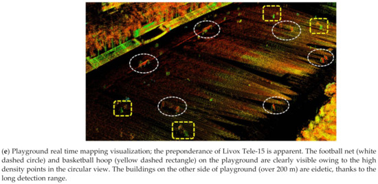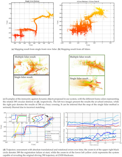 - The advantage of integrating point clouds from multiple lidars is manifest; much more environmental information can be obtained and presented. While the front lidar mapping merely depicts the road shape, multi-lidar fusion generates generous supplementary geometrical features. Thanks to the long-range Tele-15 lidar, the playground is completely preserved on the map shown in Figure 10e. As feature quality has a great impact on lidar odometry, multi-lidar fusion should be a better approach for degeneracy problems.