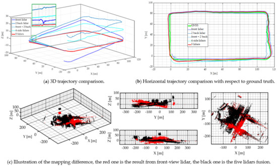 - A five-lidar fusion could eliminate the exaggerated height ramp of a single lidar approach. There were six speed bumpers on the path, causing large vertical vibrations to the vehicle. Some of these perpendicular motions are fatal to lidar odometry, as vertical displacement will be enlarged by incorrect registrations. The front lidar trajectory in Figure 13a encountered a vertical dump in the left corner, which was the result of two consecutive speed bump. With limited FoV from only the front view, the single lidar odometry was unable to correct these errors; it was further affected by error propagation in Figure 13c. Extending extra constraint features from side lidars, our approach was able to correct these errors and maintain a flat terrain.