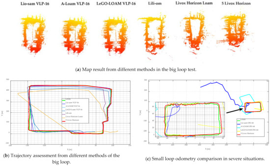 Table 1. Horizontal position error statistics of the big loop. (Compared with Velodyne VLP-16). - Multi-lidar fusion had a better performance in challenging scenarios. Shown in Figure 15c,d we carried out an experiment of small loop at class breaktime, with students and vehicles blocking the paths. Therefore, our vehicle had to avoid collisions with irregular motions, such as moving back and forth, sharp turnings, and fast accelerations. Lio-sam had the most significant failure in such areas, because of loss of landmark constraints. Since the IMU pre-integration process of the system depends heavily on lidar odometry [48], the system was liable to fail once the landmark constraint information was insufficient. The maximum error of A-LOAM came from back-and-forth motions, causing a more than 90° deviation to the trajectory. The starting area was a crowded pathway with vehicles on both sides; as our platform was much lower than common sedans, most of the surface points were cast on vehicles. Once the front view is blocked by pedestrians, the loops cannot be detected or are mismatched, hence LeGO-LOAM failed to close the loop. A crucial benefit of multi-lidar fusion is the capability of manipulating each lidar input freely. With a pre-set empirical threshold for the amount of edge points, all the edge and surface features from the individual lidars after selection were further down sampled to 10% of their original size once the threshold was reached. This is similar to shutting down some typical view angles of a mechanical lidar, and thus alleviating bad impacts in certain areas. Moreover, the major part of dynamic objects in the front view can be removed by point-to-edge and point-to-plane residuals. With the help of the two mentioned improvements, our multi-lidar fusion solution had a strong capability in severe situations, and the end-to-end errors were small, as presented in Table 2.
