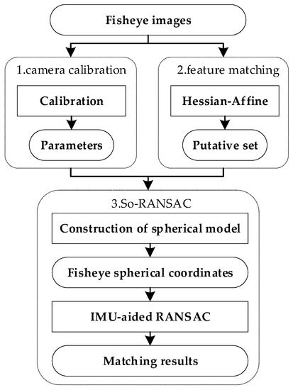 The motivation for this paper was to explore an inertial-assisted matching method suitable for fisheye images in view of the limitations of the previous multi-sensor-assisted matching method. The So-RANSAC algorithm proposed in this paper was inspired by previous works [22,28,29,30]. This method can be divided into three stages: (1) fisheye model construction: the internal parameters and the distortion parameters of the fisheye camera were obtained by calibration, and the fisheye camera imaging model was recovered from the fisheye image; (2) image feature matching: feature points were extracted by an affine-invariant detector; (3) outlier removal: So-RANSAC method was proposed to construct the fisheye spherical coordinates, and then outliers were removed. Compared with the previous methods, So-RANSAC not only improves the outlier removal accuracy by using the IMU, but also has good adaptability to fisheye distortion. The main innovation of this paper is the construction of a fisheye spherical model that restores the fisheye epipolar constraints and improves the outlier removal accuracy. The overall process of our method is shown in Figure 1.
