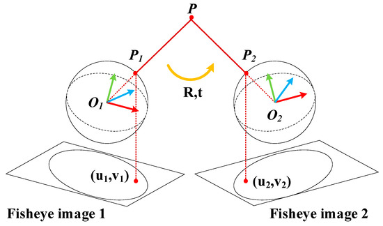 The fisheye images undergo severe distortions such that the perspective geometry of rectilinear perspective images cannot be directly applied to fisheye images [34]. Specific projections (e.g., panoramic or log-polar) can reduce the distortions, while the spherical projection is a non-deformed model for the fisheye images. The projection of the visual information on the sphere correctly handles the information without introducing distortion [21]. Therefore, we adopted the spherical projection to restore the epipolar geometric relationship of the fisheye image and apply the RANSAC method to the fisheye image. The projection of image coordinates onto a sphere was conducted on the basis of calibration as shown in Figure 3.