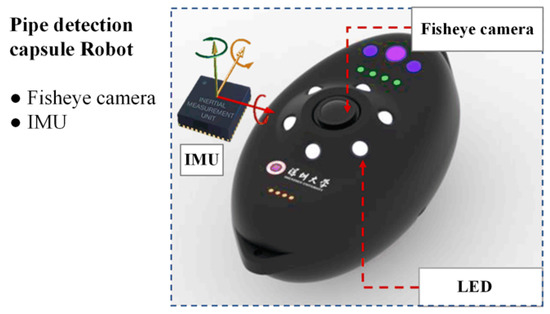 The real application was the detection of urban drainage pipes. The fisheye images of the drainage pipe were acquired by a self-developed pipe capsule robot. The robot had a small, portable structure and traveled in the pipeline by drifting; it also had a high work efficiency and autonomously localized and detected pipeline issues. An IMU and a fisheye camera were integrated into the robot. The type of IMU was an ICM-20689 high-performance six-axis microelectromechanical systems (MEMS), and the fisheye lens was a high-definition 220° wide-angle lens. The main hardware specifications of the capsule robot are shown in Table 1.