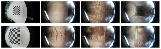 The appearance of the capsule robot is shown in Figure 4. The original data taken by the robot were 1080p video data, and the frame rate was 60 frames per second. The video was sampled at 30 frames per second to obtain discrete fisheye images as shown in Figure 5. Due to the complex internal environment of drainage pipes, the factors that affected the fisheye image matching problem included motion blur and lens occlusion caused by the water environment, fisheye distortion, and the lack of texture caused by the pipe surface material. Therefore, the fisheye image matching task of this scene was challenging.